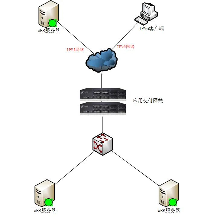 参见如下的网络逻辑示意图,应⽤交付控制器作为 IPv6 和 IPv4 的协议网关来部署,同时提供数据中心 Web 应用服务器集群的负载均衡等应用交付的功能。数据中心内部的应用程序还没有经过 IPv6 的改造,依然是 IPv4 的环境,应用交付控制器分别连接 IPv6 和 IPv4 两个网络,通过虚拟服务器方式将数据中心的 Web 应用发布在 IPv6 的网络中(图中以虚拟服务器vs_main: 2017:1::158:80 对 IPv6 的客户端发布),IPv6 网络中的客户端可以访问应用交付网关发布的 IPv6 的虚拟服务器,通过代理的方式将请求转发给数据中心内部的真实服务器,得到响应内容之后将返回的内容再转换成 IPv6 数据包返给客户端,从而保证客户端能够在⼀个 IPv6 的网络中访问数据中心 IPv4 的应用。